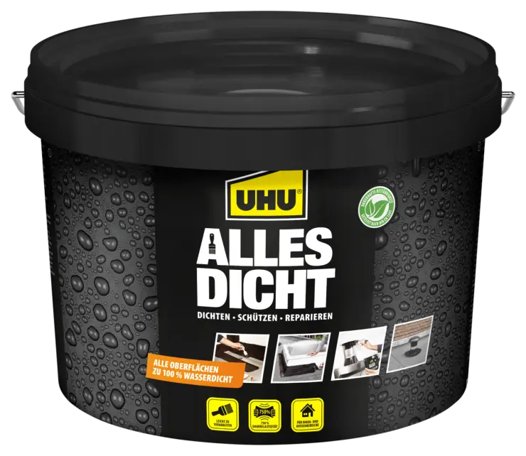 Dicht- und Schutzanstrich zum wasser- und luftdichten Abdichten, Schützen und Reparieren. Hervorragende, universelle Qualität, geeignet für fast alle Oberflächen. Geeignet für den Innen- und Außenbereich, von der Abdichtung von Bädern bis zur Reparatur von Dachrinnen, vom Schutz von Gartenholz bis zur Abdichtung von Anschlüssen. Bei der Überbrückung von Rissen, Spalten und Nähten, erleichtert die Verwendung in Kombination mit Alles Dicht Textilband den Schichtaufbau.