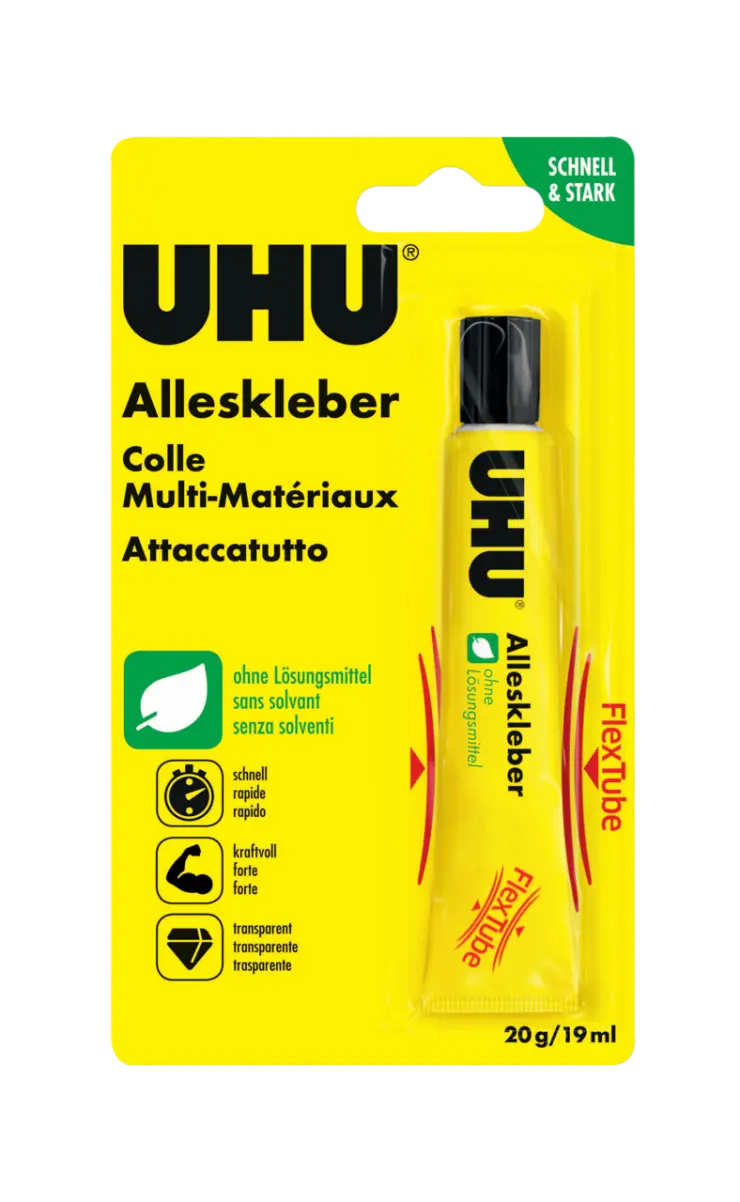 Universell - klebt Pappe, Papier, Filz, Leder, Kork, Stoff, Holz untereinander sowie auf Metall, Porzellan, Glas, Styropor® und viele Kunststoffe.