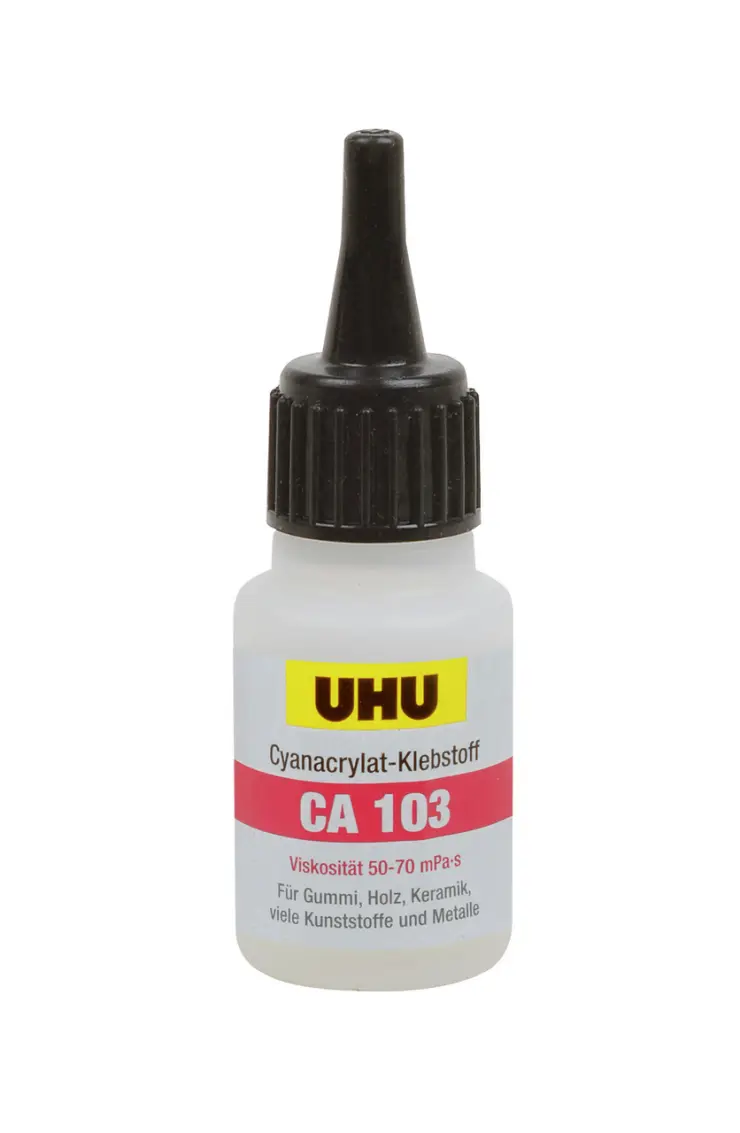 Schrauben Sie zuerst den Deckel ab und setzen den Applikator auf die Flasche. Schneiden Sie die Spitze der Applikatordüse ab. Tragen Sie den Kleber so dünn wie möglich auf einer Seite direkt mit Hilfe der Düse aus der Flasche auf (zu viel Klebstoff verlangsamt den Aushärtungsprozess erheblich, da Cyanacrylate durch die an der Oberfläche der zu verklebenden Teile absorbierte Feuchtigkeit nur in dünnen Schichten schnell und vollständig aushärten). Drücken Sie die zu verklebenden Teile sofort zusammen. Nach dem Aufbringen und dem Zusammenpressen der beiden Fügeteile polymerisiert der Klebstoff in der Klebefuge je nach Material innerhalb weniger bis zu etwa 45 Sekunden zu einem Kunstharz aus und verbindet die beiden Teile hochfest. Reinigen Sie die Düse nach dem Gebrauch mit einem trockenen Tuch und verschließen Sie die Flasche anschließend mit der Schutzkappe.