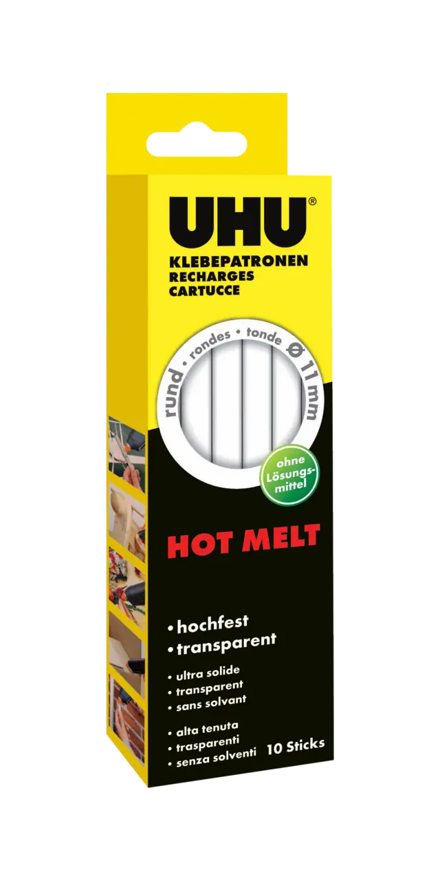 Transparente und hochfeste Heißklebepatronen, mit einem Durchmesser von 11 mm. Eignen sich zum Heimwerken, Reparieren, Fixieren, Abdichten und Isolieren. Können ein allen handelsüblichen Klebepistolen, für die Klebepatronen mit einem Durchmesser von 11 mm geeignet sind, eingesetzt werden.