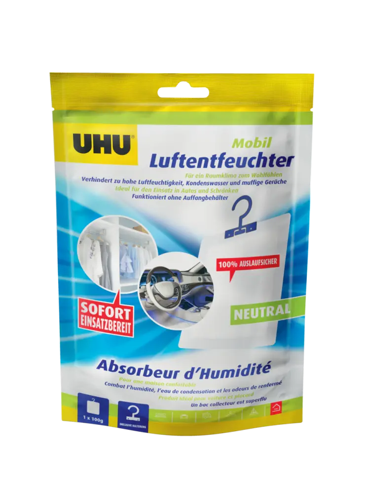 Durch seine kompakte Größe ist Luftentfeuchter Kompakt/Mobil ideal geeignet, um Feuchtigkeitsprobleme in Autos, Kleiderschränken, Umzugs- und Aufbewahrungsboxen, Sporttaschen, Schuhschränken, Wohnwagen, Booten usw. wirksam zu bekämpfen. Luftentfeuchter Kompakt/Mobil lässt sich außerdem mit dem mitgelieferten Aufhänger leicht aufhängen.