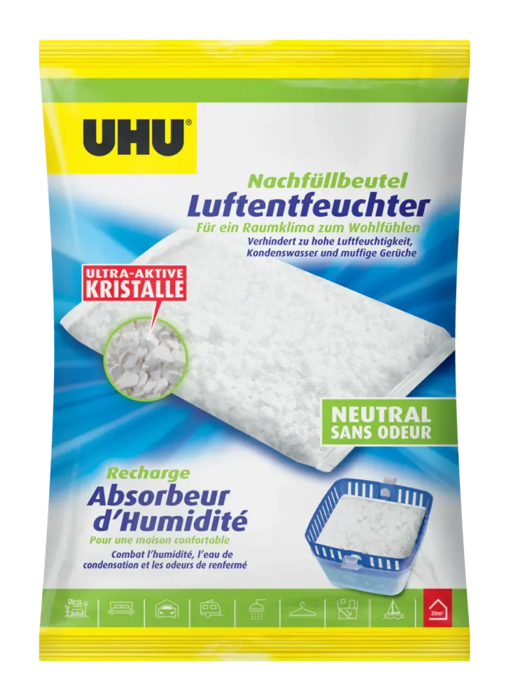 Bei niedrigeren Temperaturen arbeitet der Feuchtigkeitsabsorber langsamer und es kann zu Verklumpungen kommen. Durch Erhöhen der Temperatur wird die Wirkung wieder beschleunigt. Vermeiden Sie den Kontakt mit Leder, Holz, Stein und Metall, da diese Materialien negativ beeinflusst werden können.
