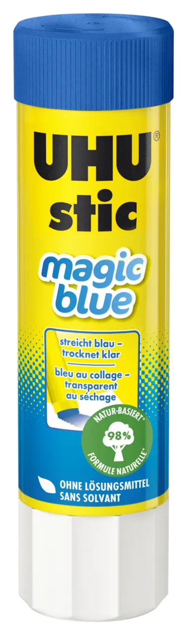 UHU stic Magic Blue wird mit leichtem Druck auf den zu verklebenden Materialien aufgetragen. Die Teile werden direkt nach dem Auftragen des Klebstoffes zusammengedrückt. Die blaue Farbe verschwindet nach ein paar Sekunden und ist nach dem Trocknen transparent.